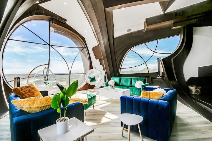 It's listed in Airbnb's OMG! collection - the curated category of "you're not going to believe this is a real rental." It sleeps up to six and comes with a full kitchen, laundry, and 360-degree views of the canyon and landscape below. The inside looks like what happens when a mid-century architect goes full mad scientist and decides blueprints are optional.