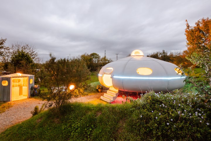 Somewhere in the UK, a grounded flying saucer is available for nightly booking. We’re not kidding. The interior is space-white with rounded walls, ‘80s arcade games including Space Invaders, and a front door that opens via remote control. It lives in Airbnb’s OMG! category — a collection built for listings that make you say, well, you know.